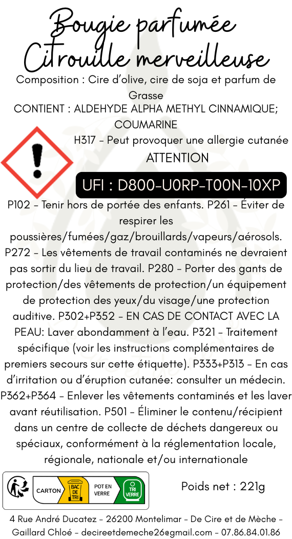 EUH208 - contient : ALDEHYDE ALPHA METHYL CINNAMIQUE; COUMARINE