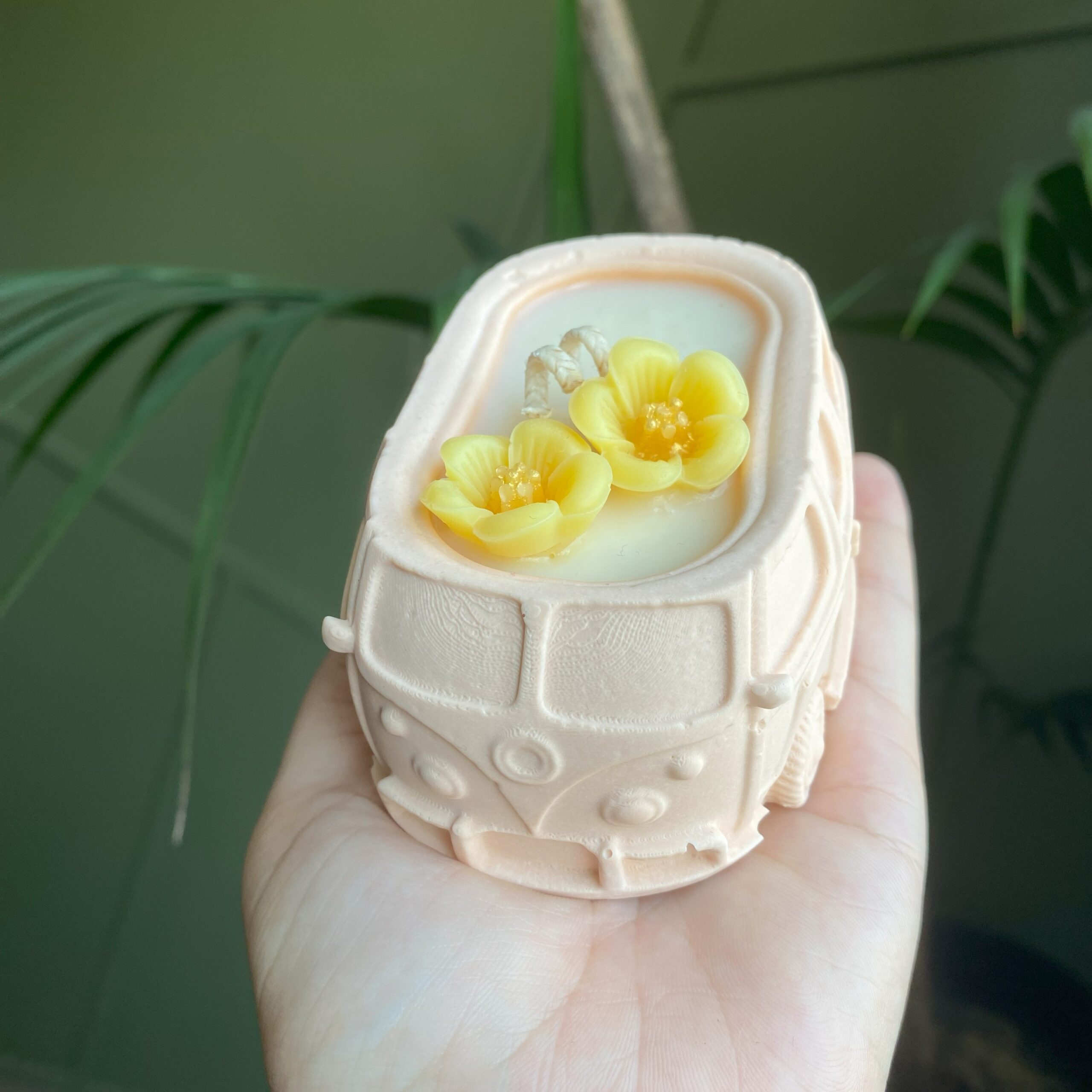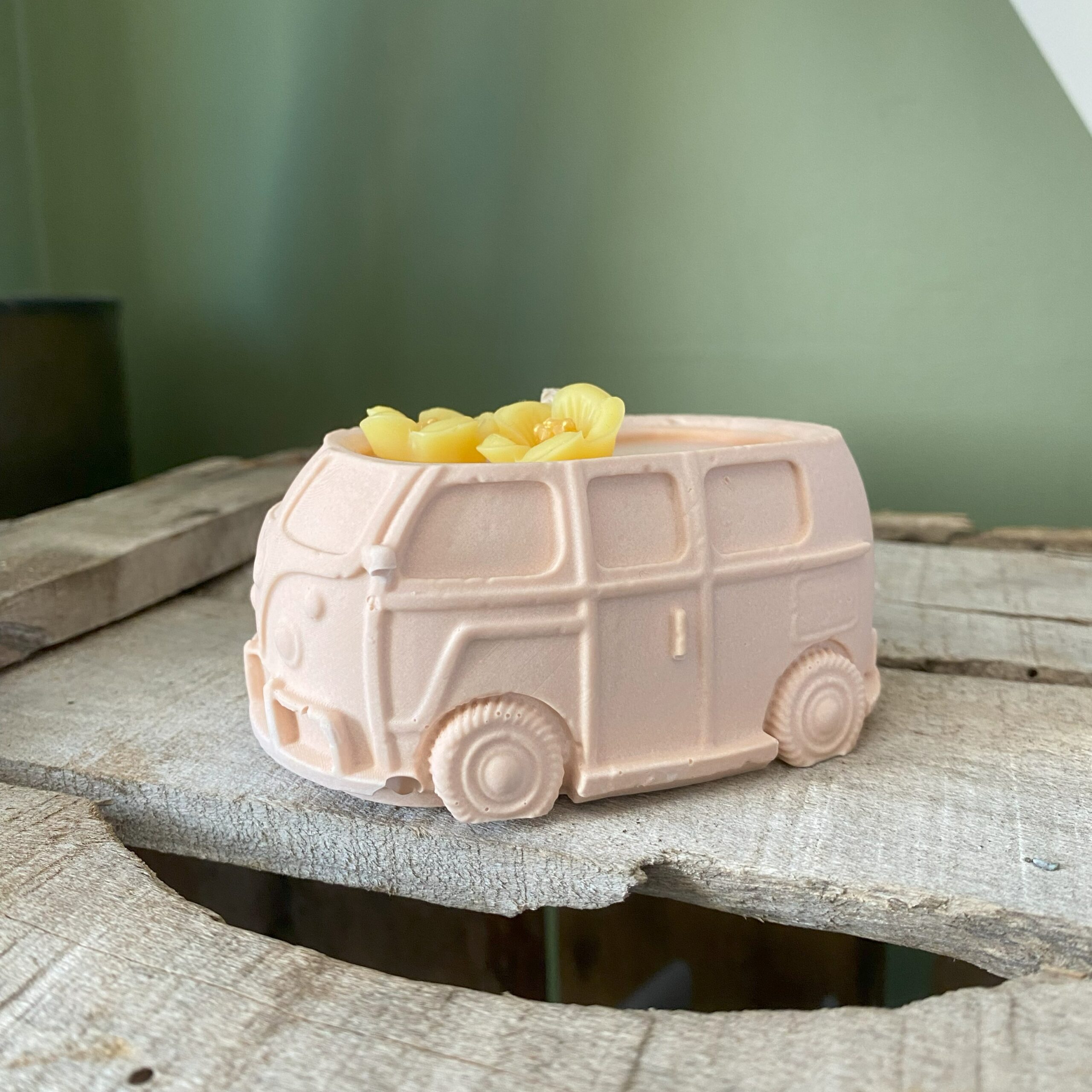 Coulée à la main dans un pot en Jesmonite unique en forme de van vintage, chaque pièce est une invitation au voyage, à la fois déco et durable.