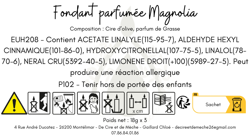 Voici mes fondants parfumés au magnolia, conçus pour transformer votre espace en un véritable havre de paix. Coulée à la main avec des ingrédients de haute qualité, ils diffusent une fragrance délicate et florale, inspirée par la beauté élégante des fleurs de magnolia.